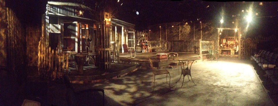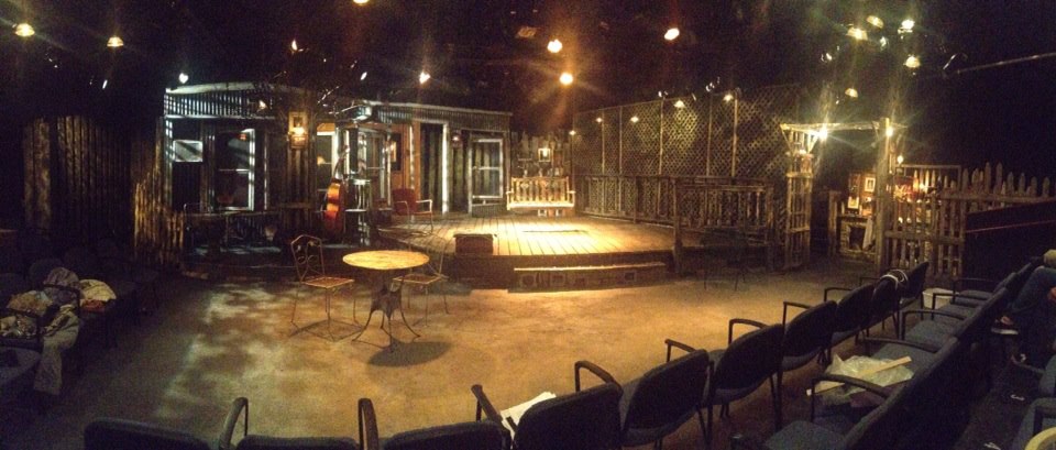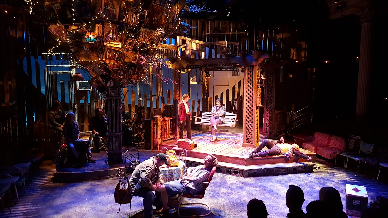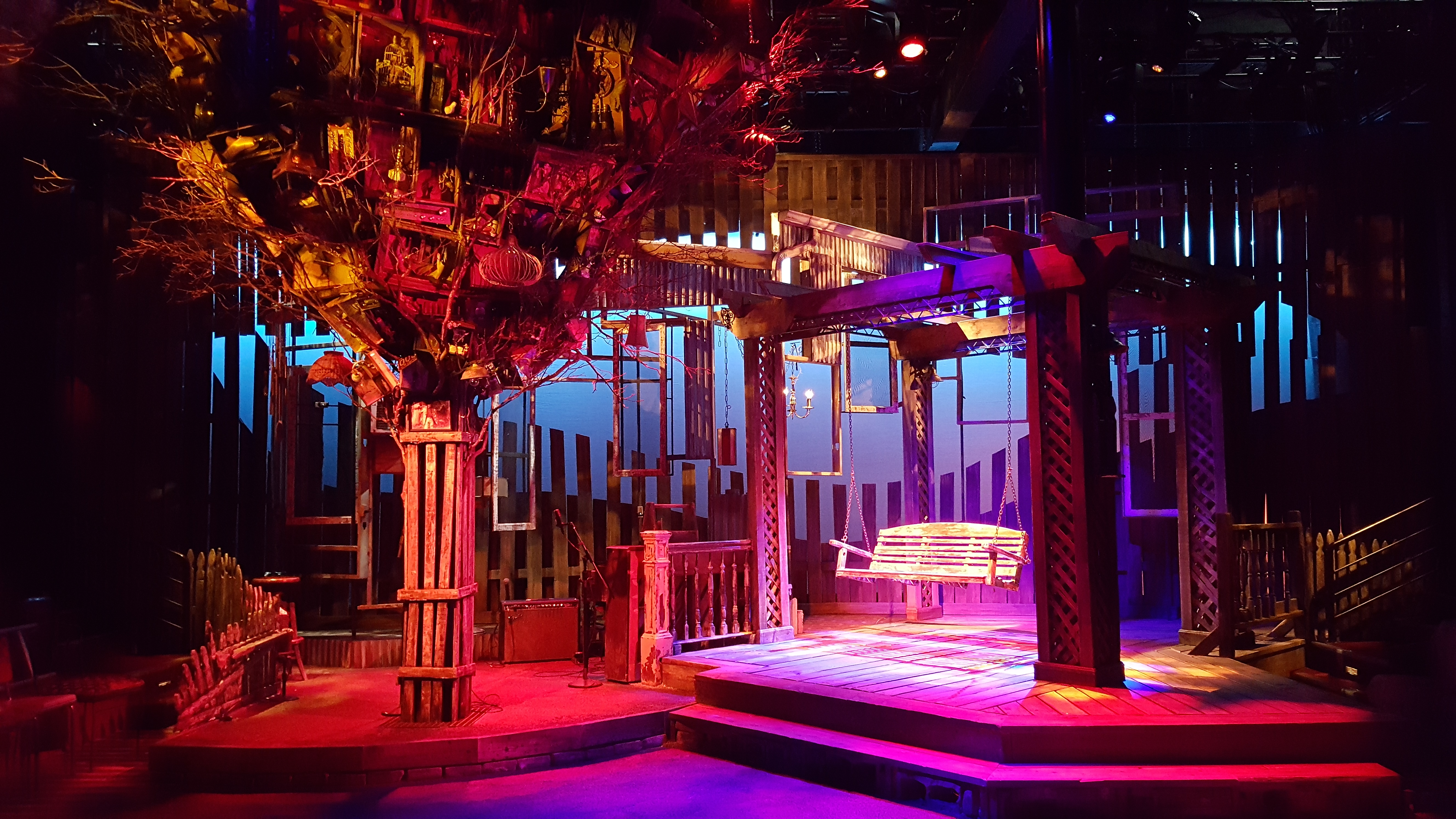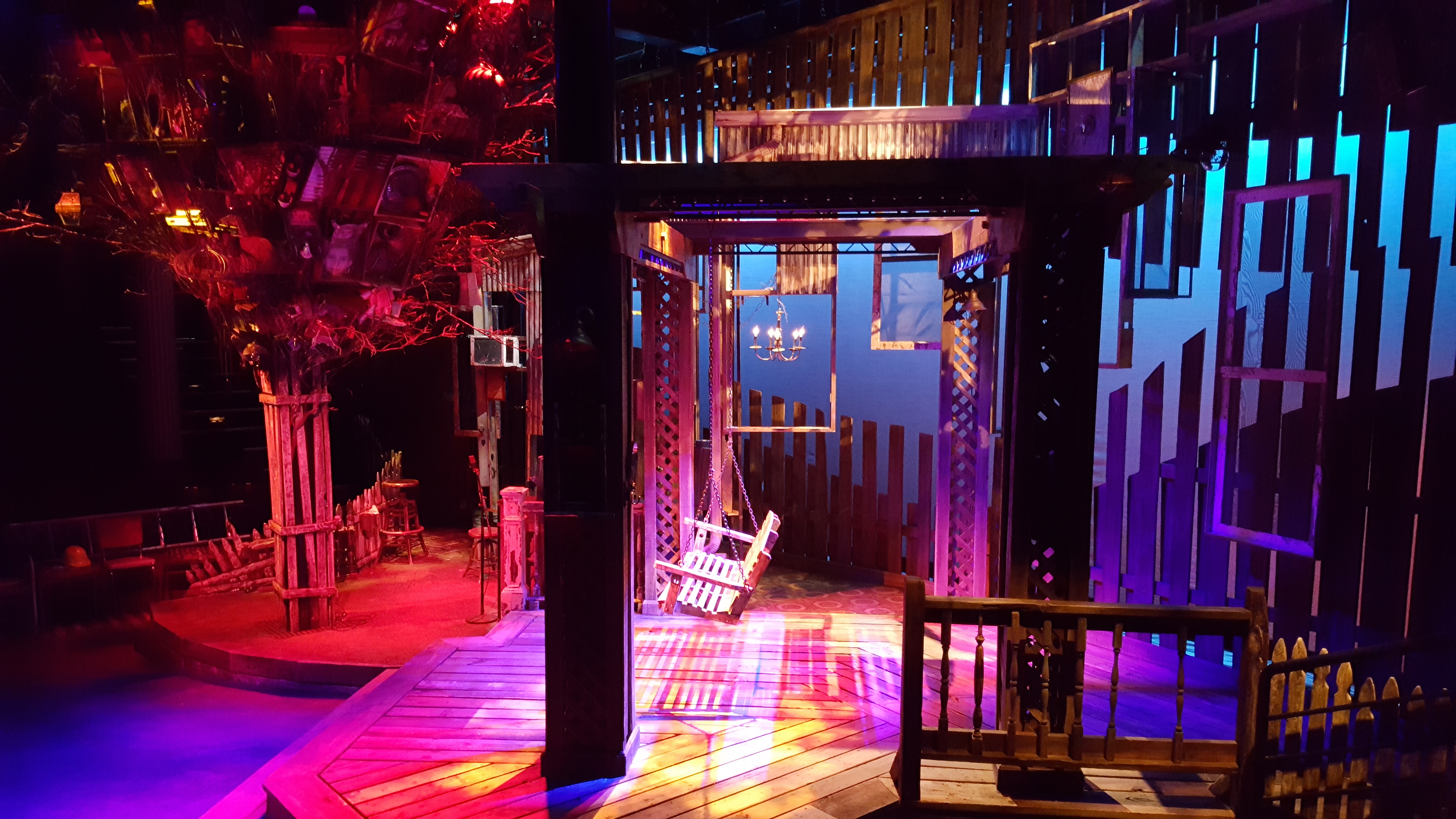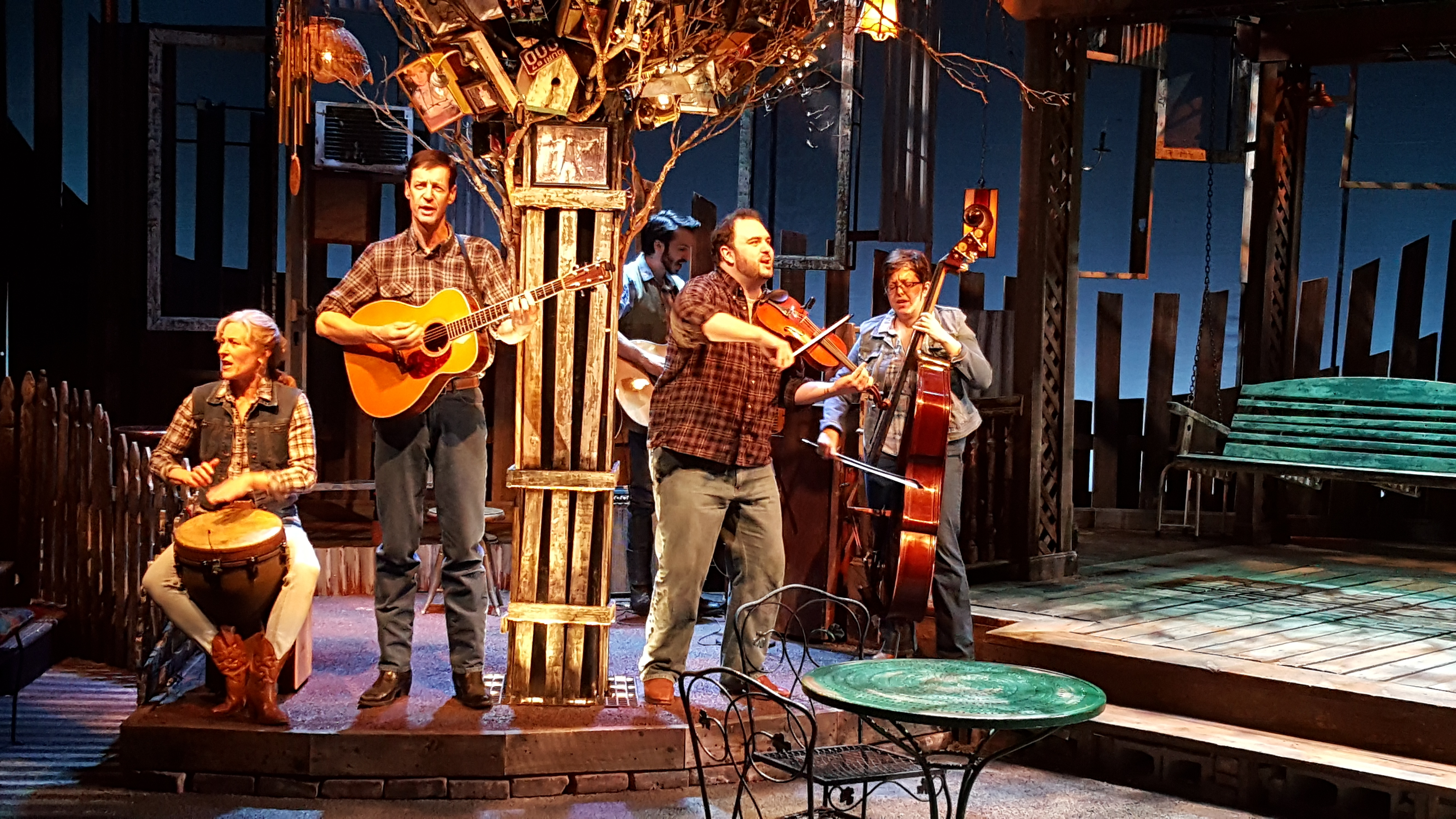 “The band is situated on a small front porch rendered nicely as part of James J. Fenton’s set design, with musical director Emily Otto conducting surreptitiously from within the front parlor. Fenton’s evocative design also includes a broad back deck upon which a very inviting porch swing serves as the site for several assignations, as well as a significantly-sized playing area thrust out toward the audience. There’s also a large scraggly tree located in Robert’s back yard, which plays an important role in the action.”