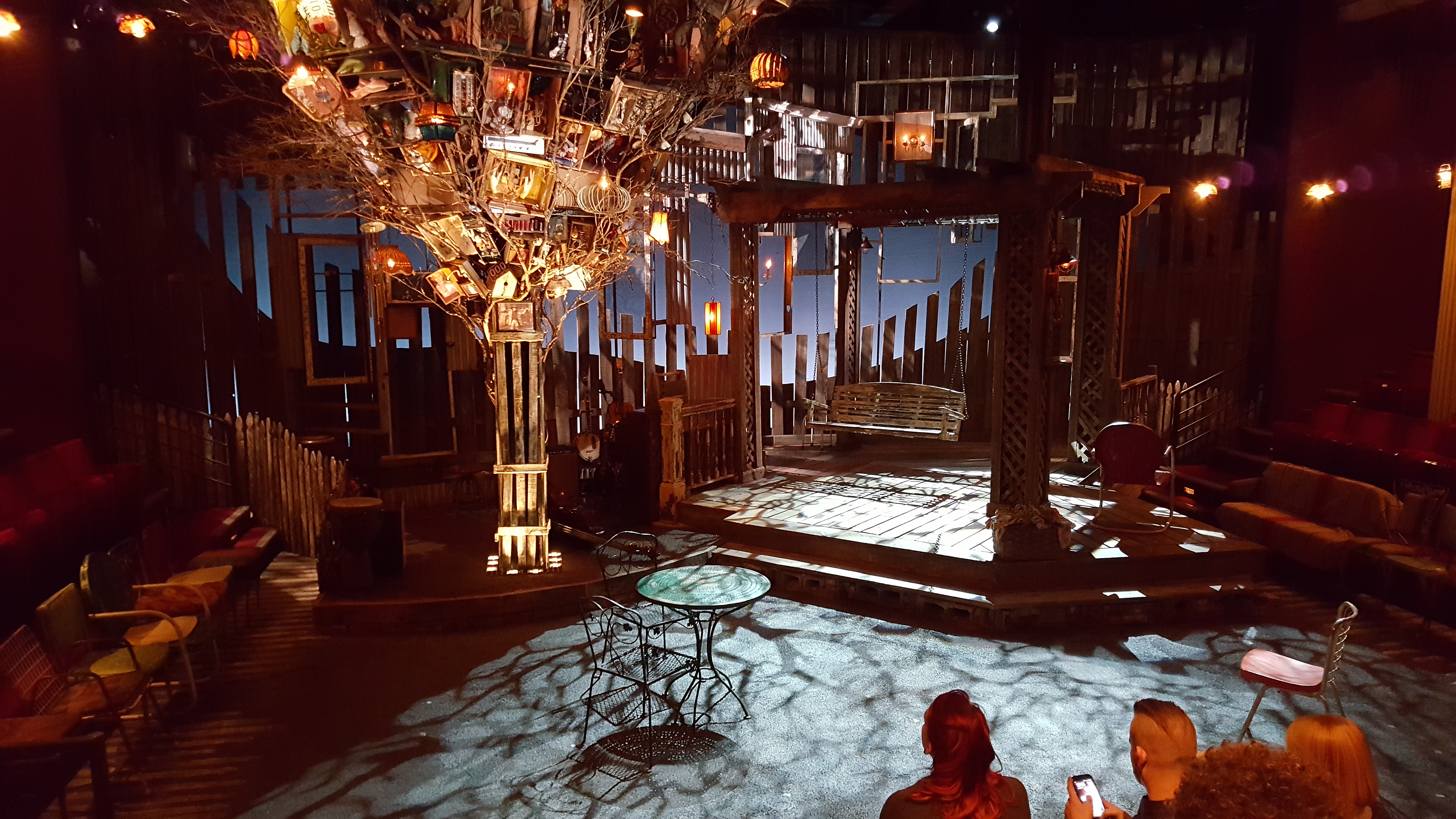 "..the stunning set and lighting design. James J. Fenton’s set, a pure expressionist fantasy of a wooded retreat deep in the woods, is protected by a Tree of Life, a soaring wooden structure made of multiple shadow boxes containing artifacts precious to someone and miniature scenes of (one assumes) happy moments in the life of the house. Ed McCarthy’s romantic lighting casts a soft blue glaze over the swing on the porch and the canopy of trees overhead." VARIETY, by Marilyn Stasio