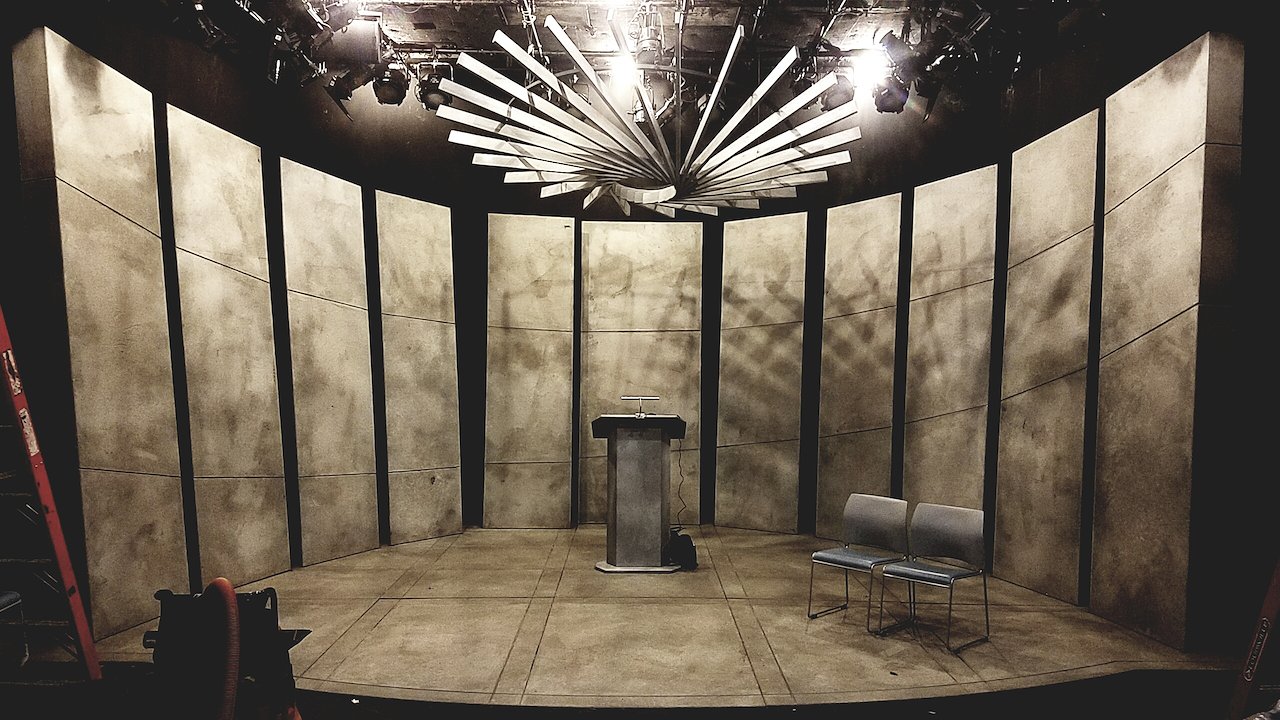 “James Fenton’s “Kunstler” set looks mundane at first: stage; lectern; small table bearing coffee, water and snacks; a basic desk and chair. But then the walls seem to come alive. The panels in this campus auditorium reveal streaked images — faces, eyes, naked legs — that could be details of Renaissance paintings.