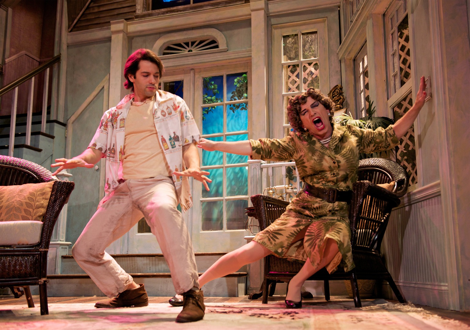 “Idris Seabright’s cottage looks idyllic. Pink paint and potted palms give her living room just the right tropical breeziness. A portrait of flinty, bearded Captain Horace Seabright hangs over her tasteful mantel, honoring the family patriarch who settled in the islands “before he went down on the Dancing Queen.” And Idris herself (Everett Quinton) is a picture of composure — primly dressed in 1950s fashions, strong-willed, and perhaps a little eccentric in her advanced age” THE VILLAGE VOICE by Tom Sellar. Photo by John Quilty.