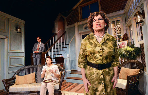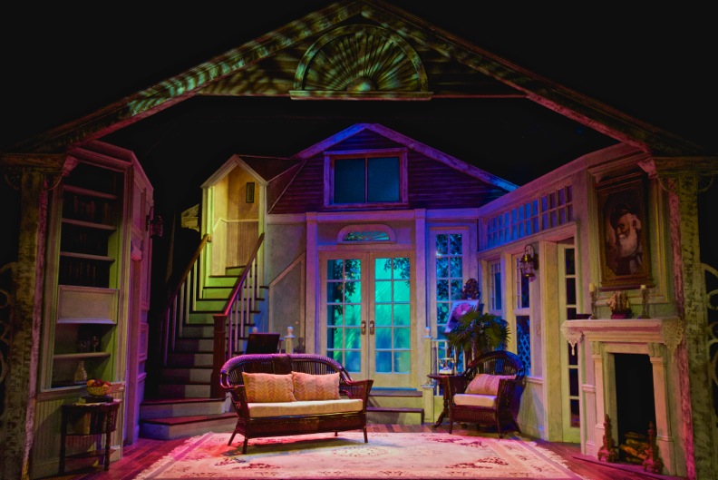 “James J. Fenton’s stage set incorporates every ornamental trick of Carpenter Gothic architecture, including a staircase that accommodates both grand entrances and pratfalls. And Ed McCarthy’s doom-laden lighting fills this Florida Keys manse with atmospheric shadows.”