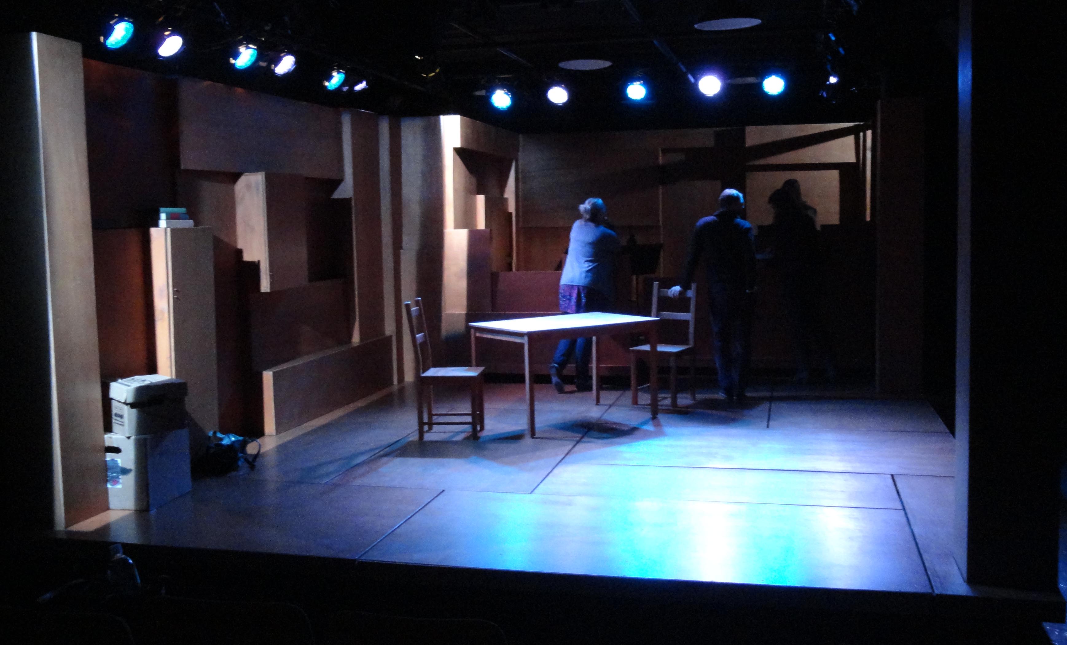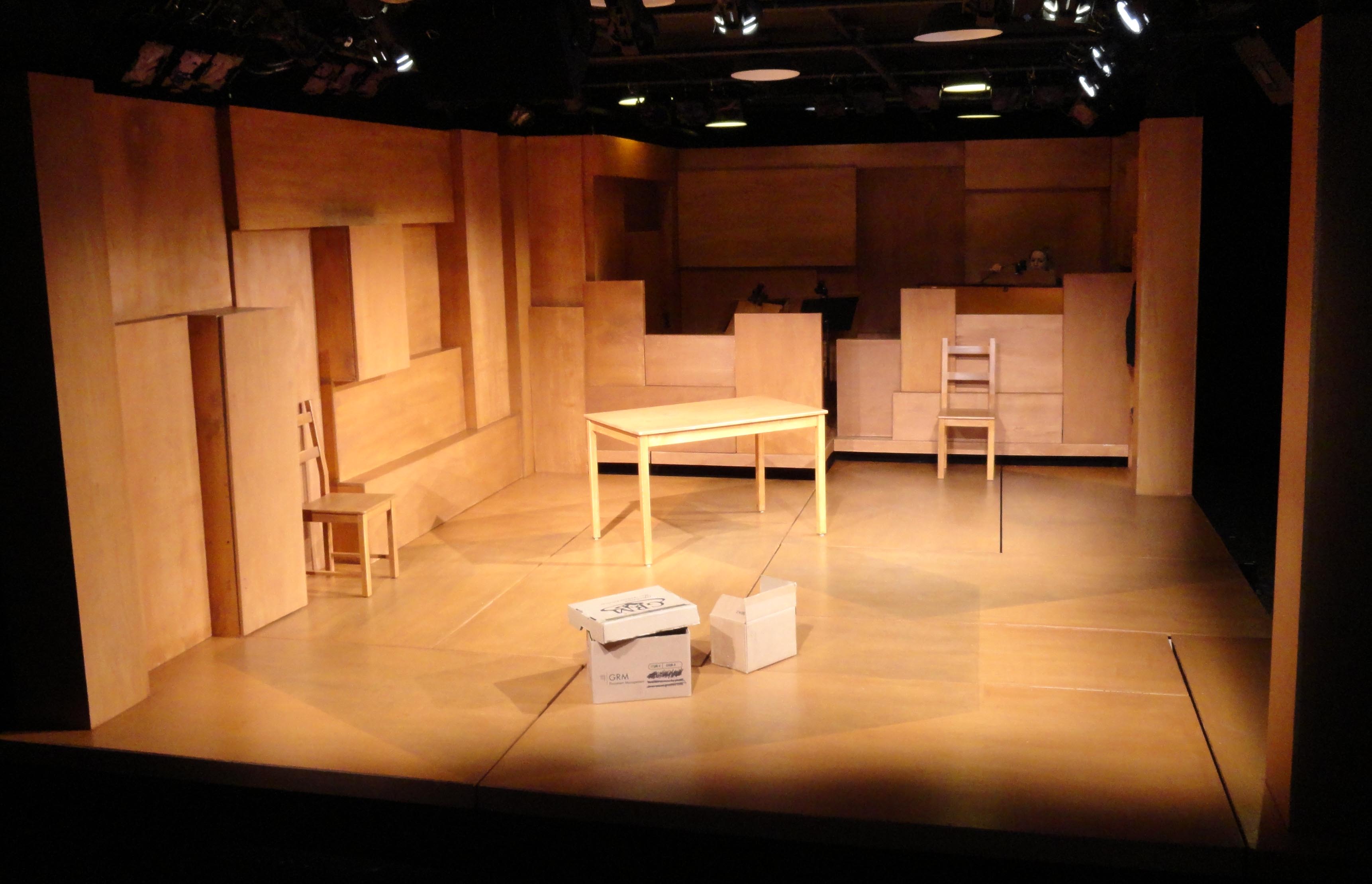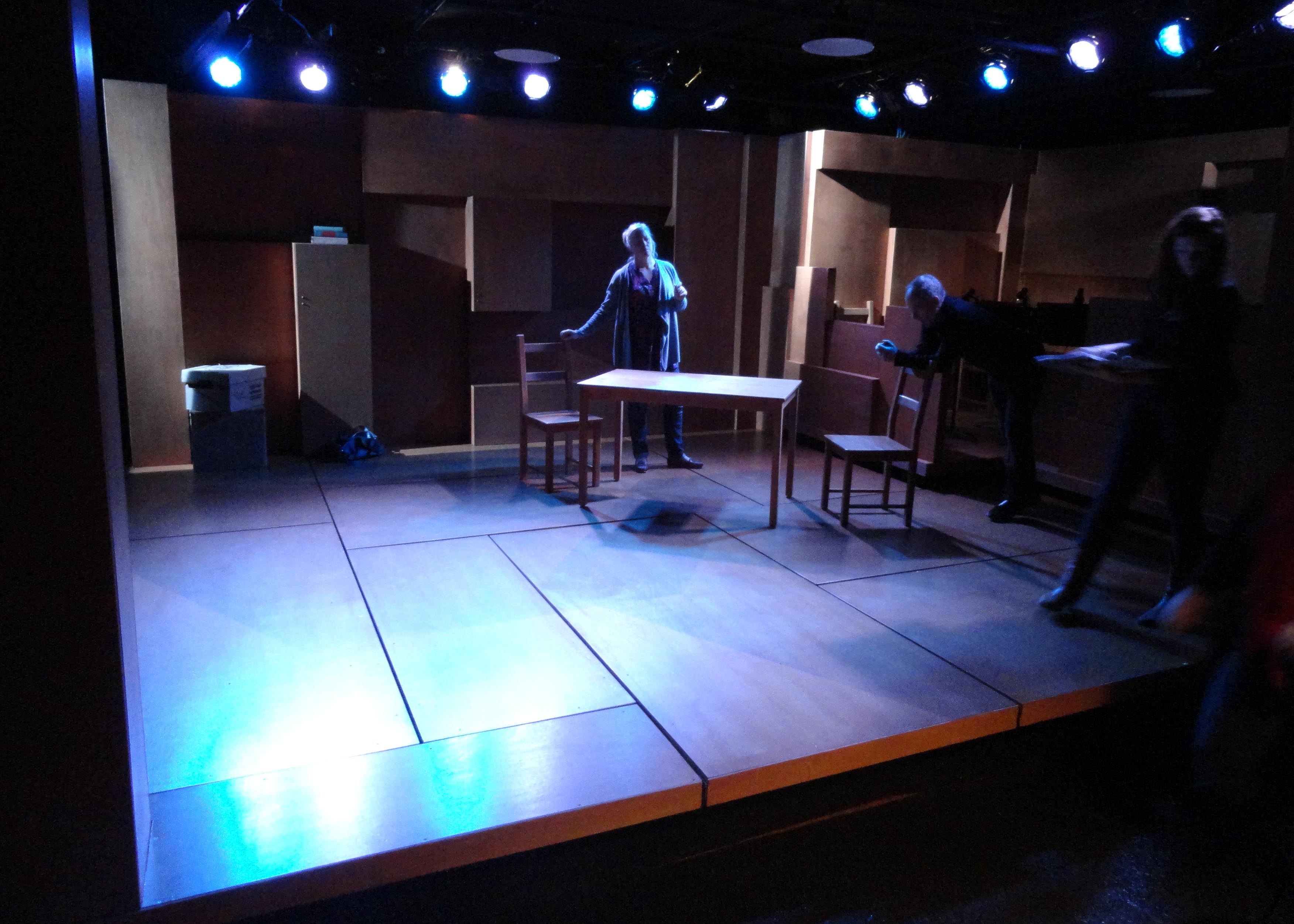 “The scenic design, by James J. Fenton, is, like the story, deceptively simple on the surface – walls and floor of blond wood, with doors and cabinets which open to reveal props as necessary. Fenton has given the floor grooves which, during blackouts, glow with light from underneath – icy blue, deeper red – just like the characters' past pain glows under their carefully controlled facades.” STAGEBUZZ.COM by Rob Hartman