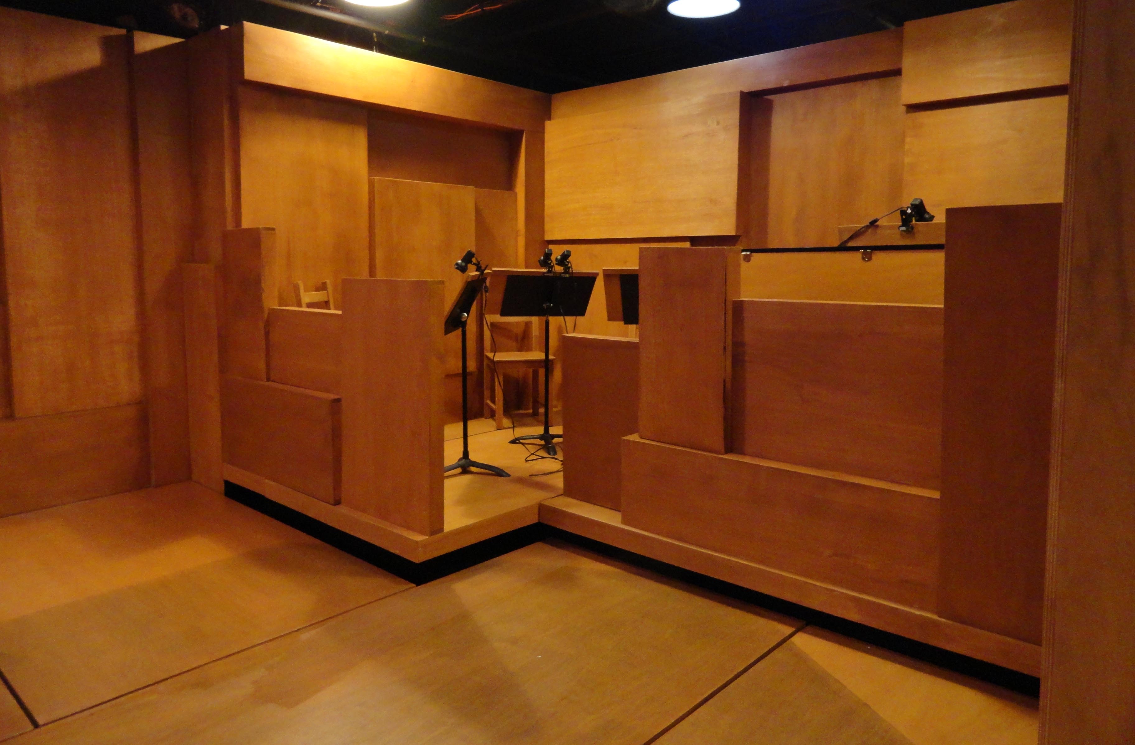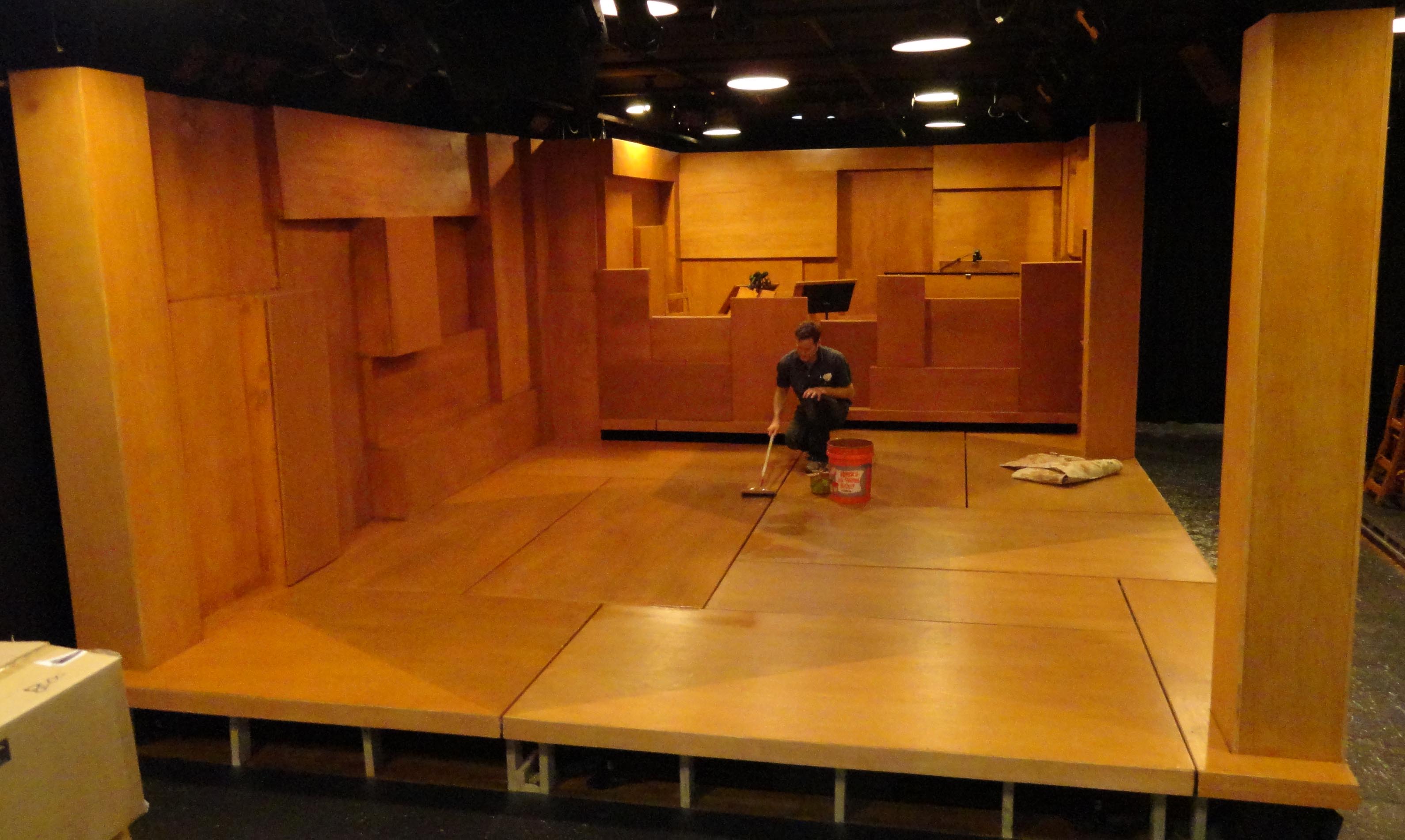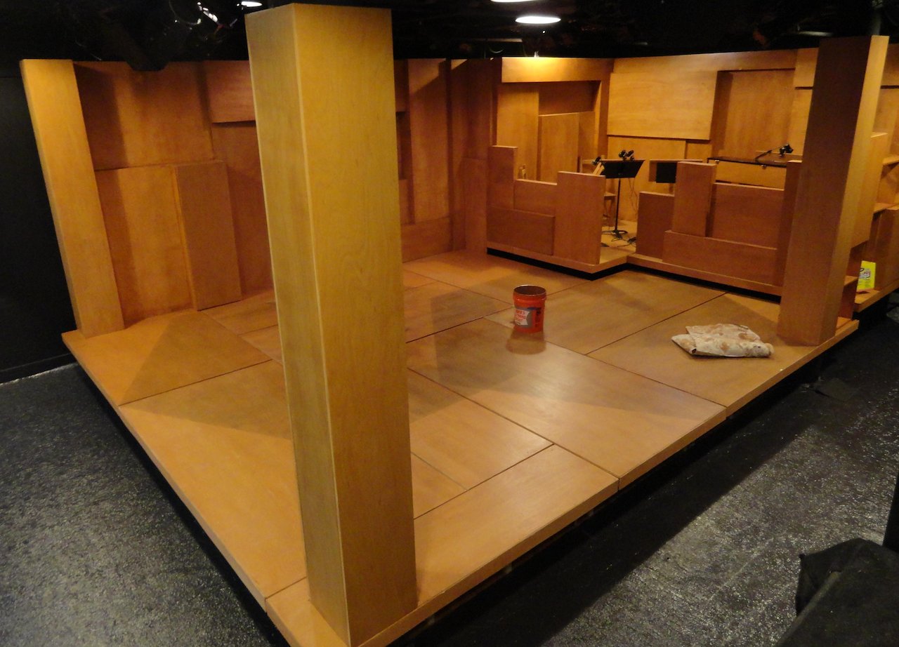 “The scenic design, by James J. Fenton, is, like the story, deceptively simple on the surface – walls and floor of blond wood, with doors and cabinets which open to reveal props as necessary. Fenton has given the floor grooves which, during blackouts, glow with light from underneath – icy blue, deeper red – just like the characters' past pain glows under their carefully controlled facades.” STAGEBUZZ.COM by Rob Hartman