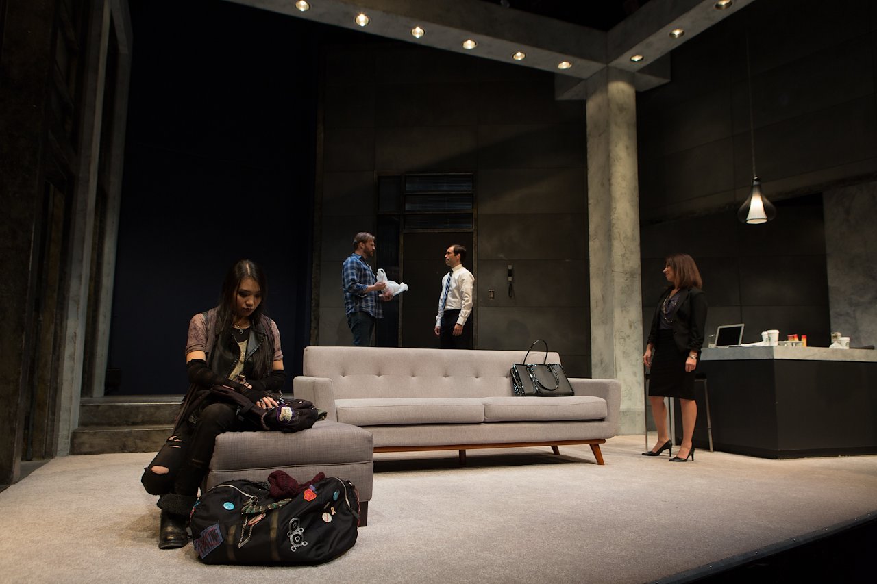 "..with the help of set designer James J. Fenton and lighting designer Paul Miller, captures the bleak world of the power brokers of the most powerful city in the world. The industrial design – floor-to-ceiling windows that prompt one of the characters to ask “where do you get dressed” and dull grays and browns – is the perfect cage for a play about four people trapped in a world of their own creation." STAGE BUDDY, by Arpita Mukherjee