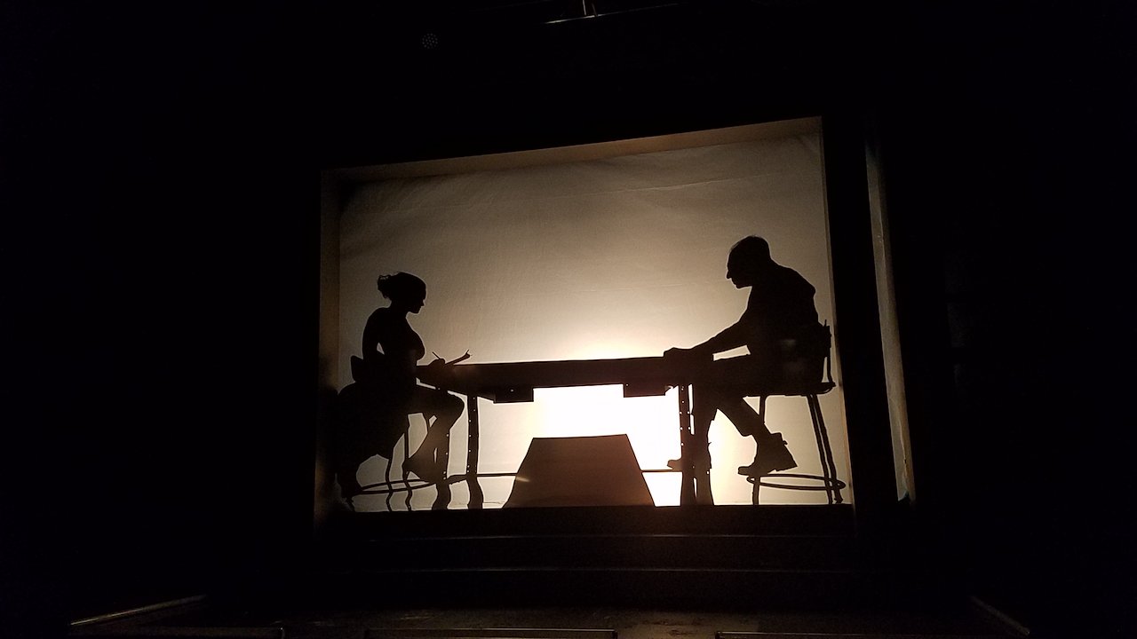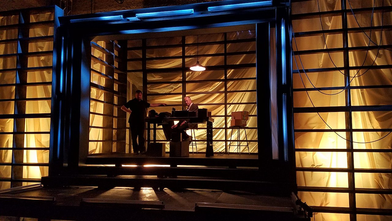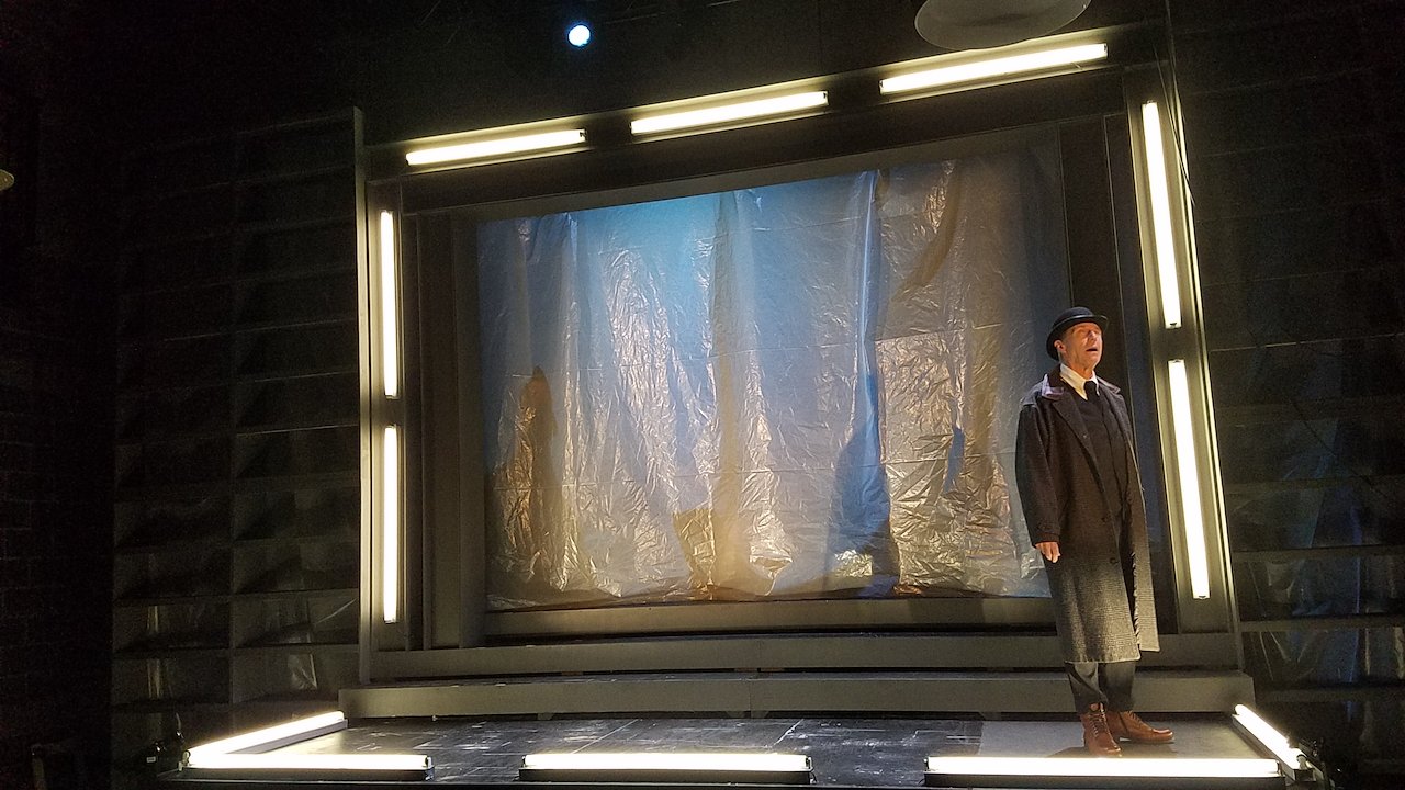 "For all of the plays, scenic designer James Fenton has framed the action in a proscenium of harsh fluorescent light, with sound designer Elizabeth Callas cranking up the melancholy via Vivaldi cello sonatas. For “Krapp’s Last Tape,” lighting designer Alexander Fetchko, taking his cue from Beckett, surrounds Krapp’s island of a desk in a sea of darkness that gradually encroaches on a sorrowful, intently listening Krapp who is, as Shakespeare would say, ‘sans everything.’" WBUR: The ARTery by Carolyn Clay.