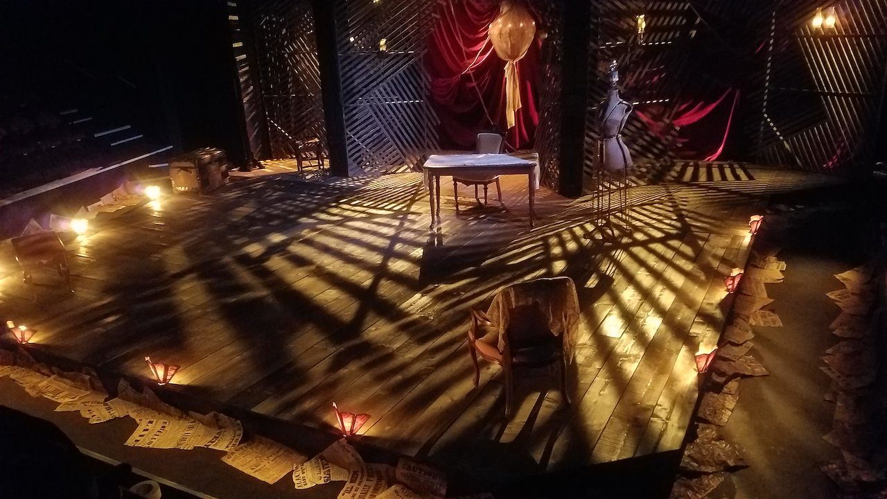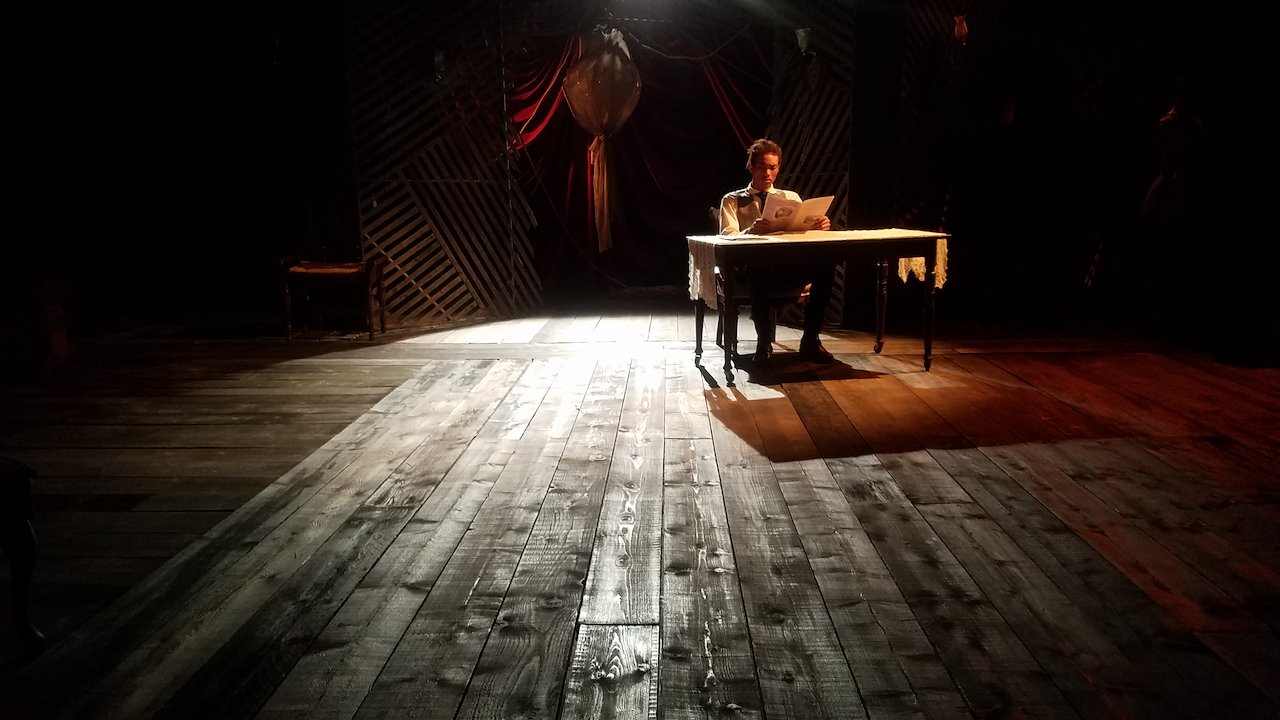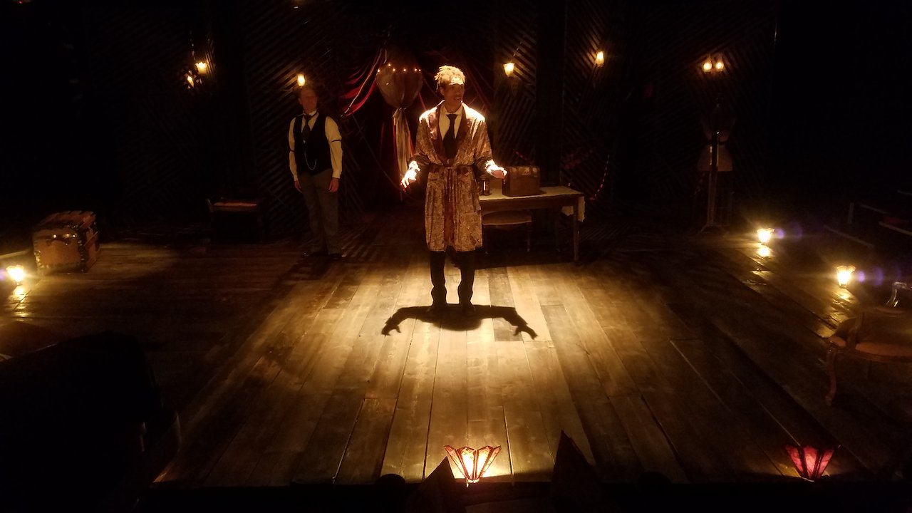 James J. Fenton, recently IRNE-nominated for his work on Merrimack Rep’s “Silent Sky” has festooned the theaters in the play with playbills from the 1833 engagement, gas lights and the red velvet in question. Alexander Fetchko’s evocative lighting with its dimly-lit areas and shadows complements Becca Jewett’s costumes, which are period perfect without suffocating the actors.” ON BOSTON STAGES, Rich Fahey