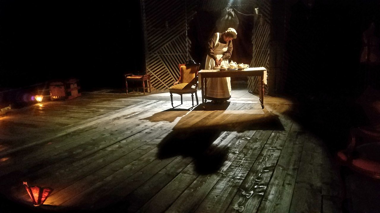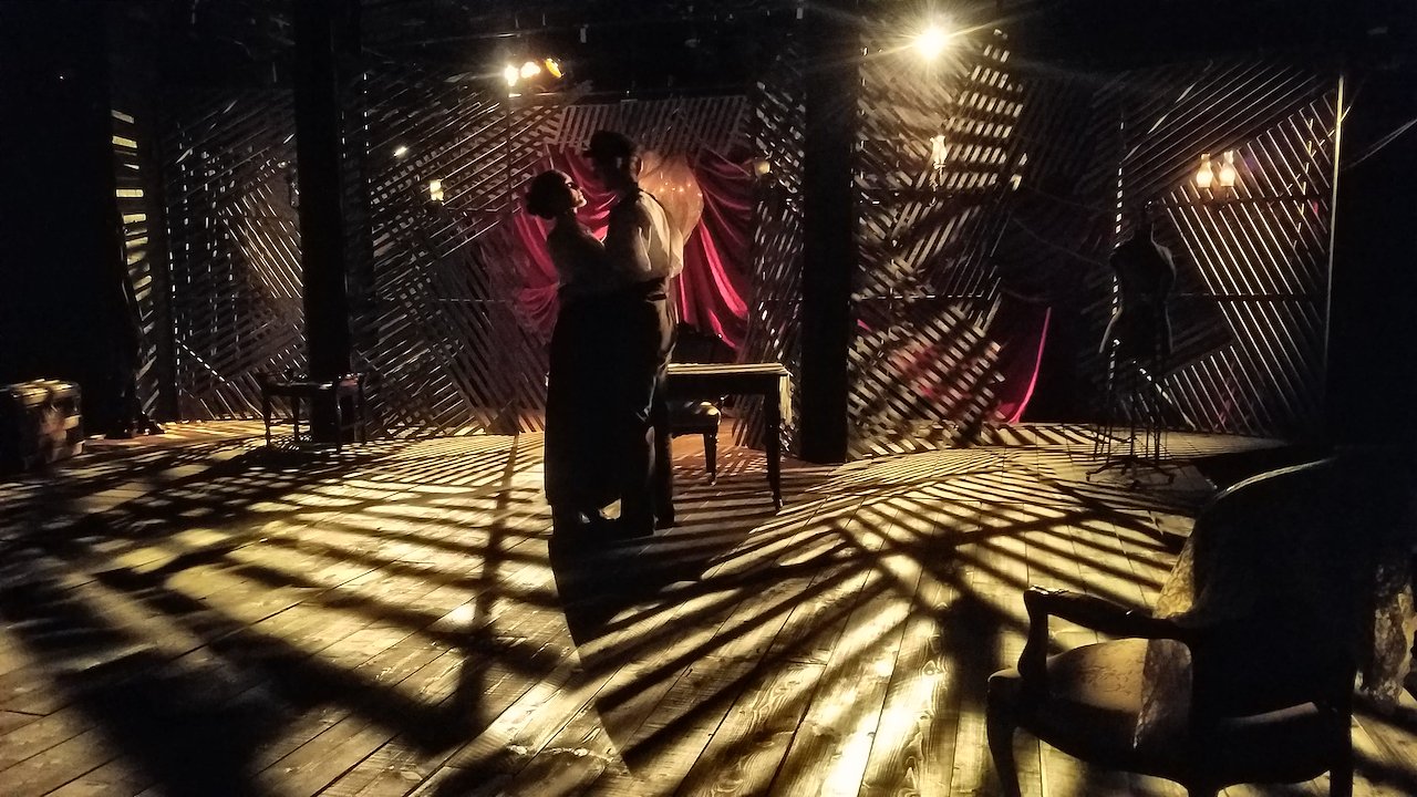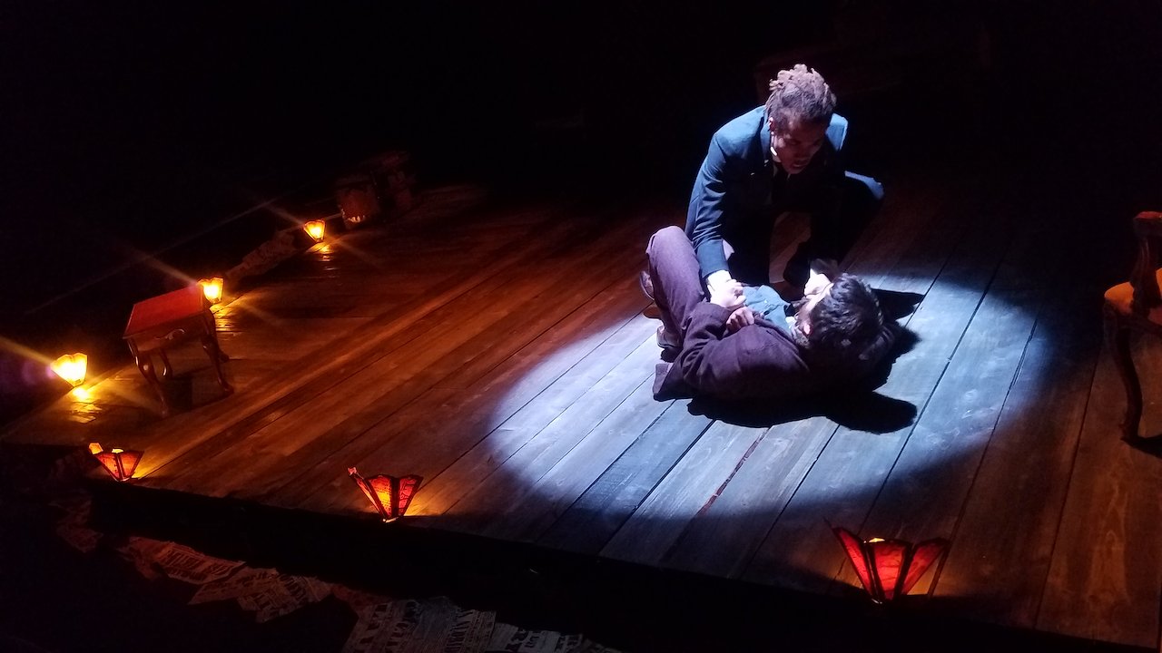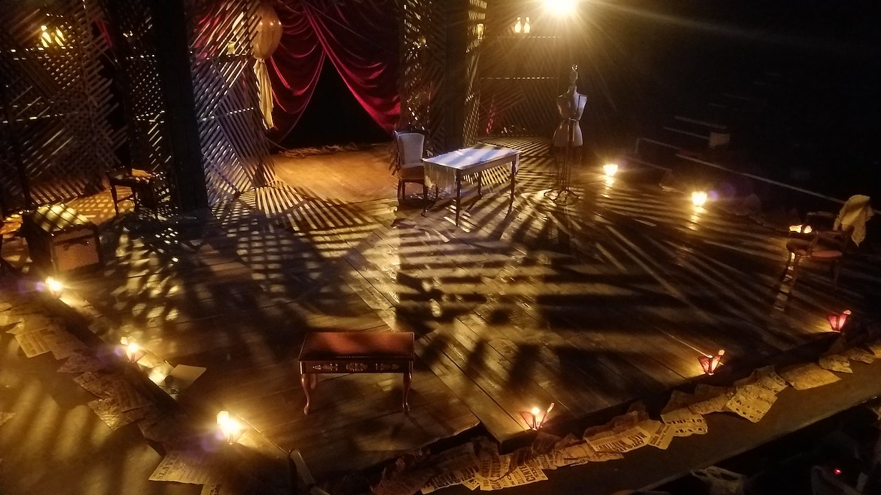 James J. Fenton, recently IRNE-nominated for his work on Merrimack Rep’s “Silent Sky” has festooned the theaters in the play with playbills from the 1833 engagement, gas lights and the red velvet in question. Alexander Fetchko’s evocative lighting with its dimly-lit areas and shadows complements Becca Jewett’s costumes, which are period perfect without suffocating the actors.” ON BOSTON STAGES, Rich Fahey