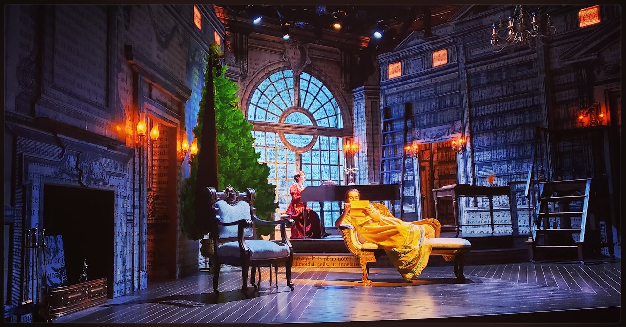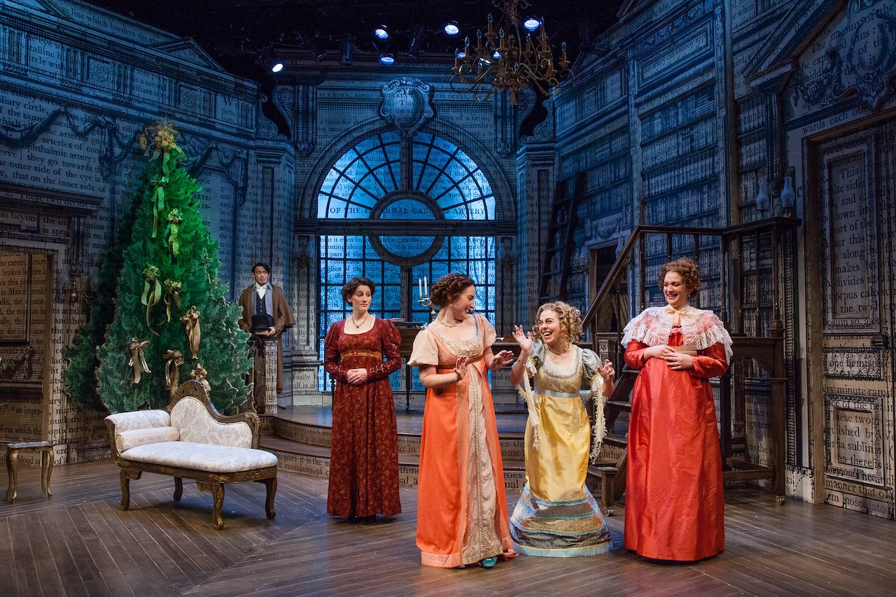 “The drawing room of the Darcys' grand estate is beautifully rendered by scenic designer James J. Fenton, with a floor-to-ceiling palladium arch window, walls covered with printed words and painted on shelves of books, and a towering (faux) Christmas tree which looms over the festivities.” – Nancy Grossman – TALKIN' BROADWAY