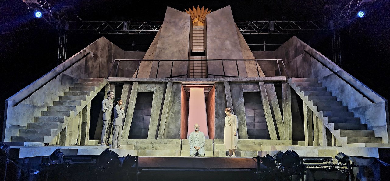 "James J. Fenton’s magnificent, imposing, and versatile set is flanked by two monitors, which roll the text in real time. Maximo Grano De Oro’s lighting design helps transform the stage from Sicily’s austere court to a shepherd’s sheep shearing party in Sicily to a stormy seascape. Rachel Padula-Shufelt’s costumes, a mix of contemporary and Elizabethan, bring home the melding of tradition with the present time, as does Mackenzie Adamick’s original score." THEATER MIRROR by Michael Hoban