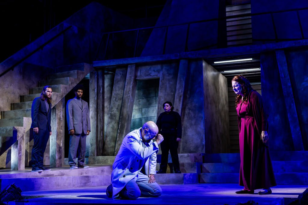 "Under the imaginative direction of Boice, in her Boston Common debut, the tragicomedy opens in the Court of Sicilia where King Leontes is raging with anger because he believes that his pregnant wife, Hermione, is having an affair with his boyhood pal and fellow sovereign Polixenes, the King of Bohemia...James J. Fenton’s fine scenic design – staged on a towering set reminiscent of Brutalist architecture – helps set the production’s various moods while costume and wig designer Rachel Padula Shufelt captures the worlds of Sicilia and Bohemia with her eye-catching array of garments and hairpieces." BROADWAY WORLD by Scott Reedy